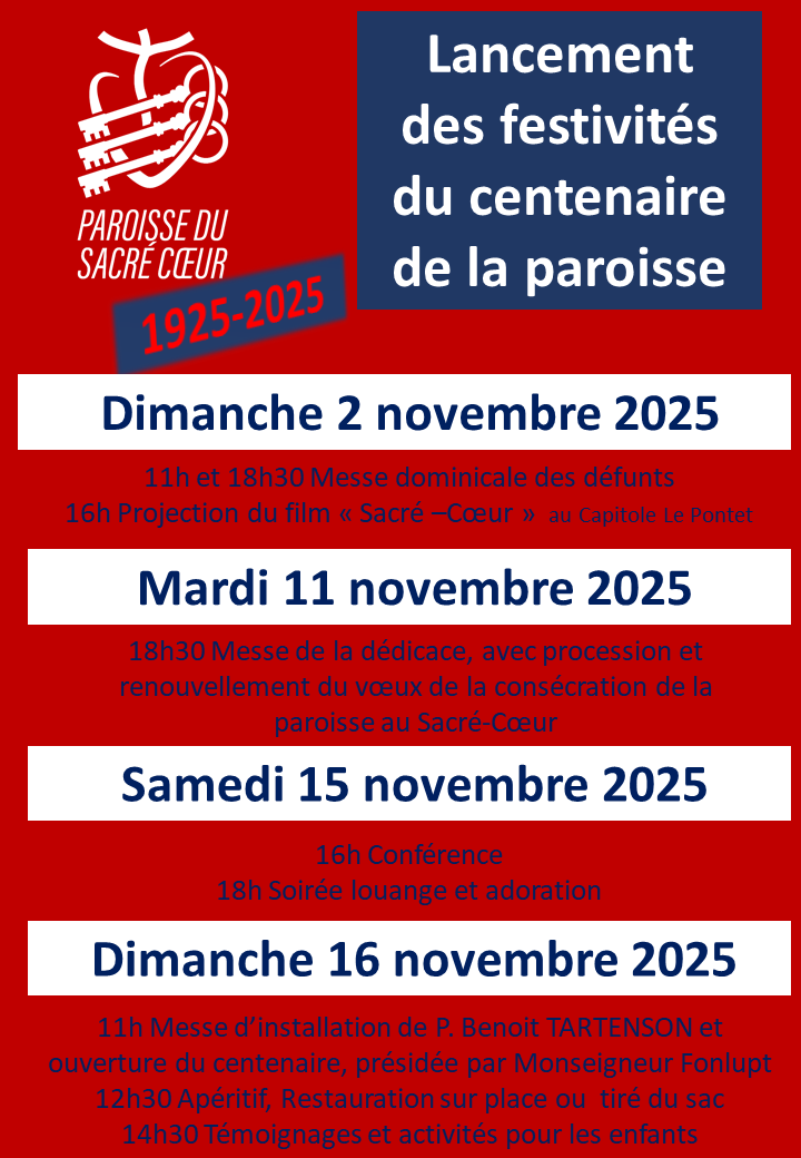 - 15h30 – Conférence du chanoine Pascal Molemb Emock : « Le Sacré-Cœur, un siècle de présence, un siècle de grâce »
